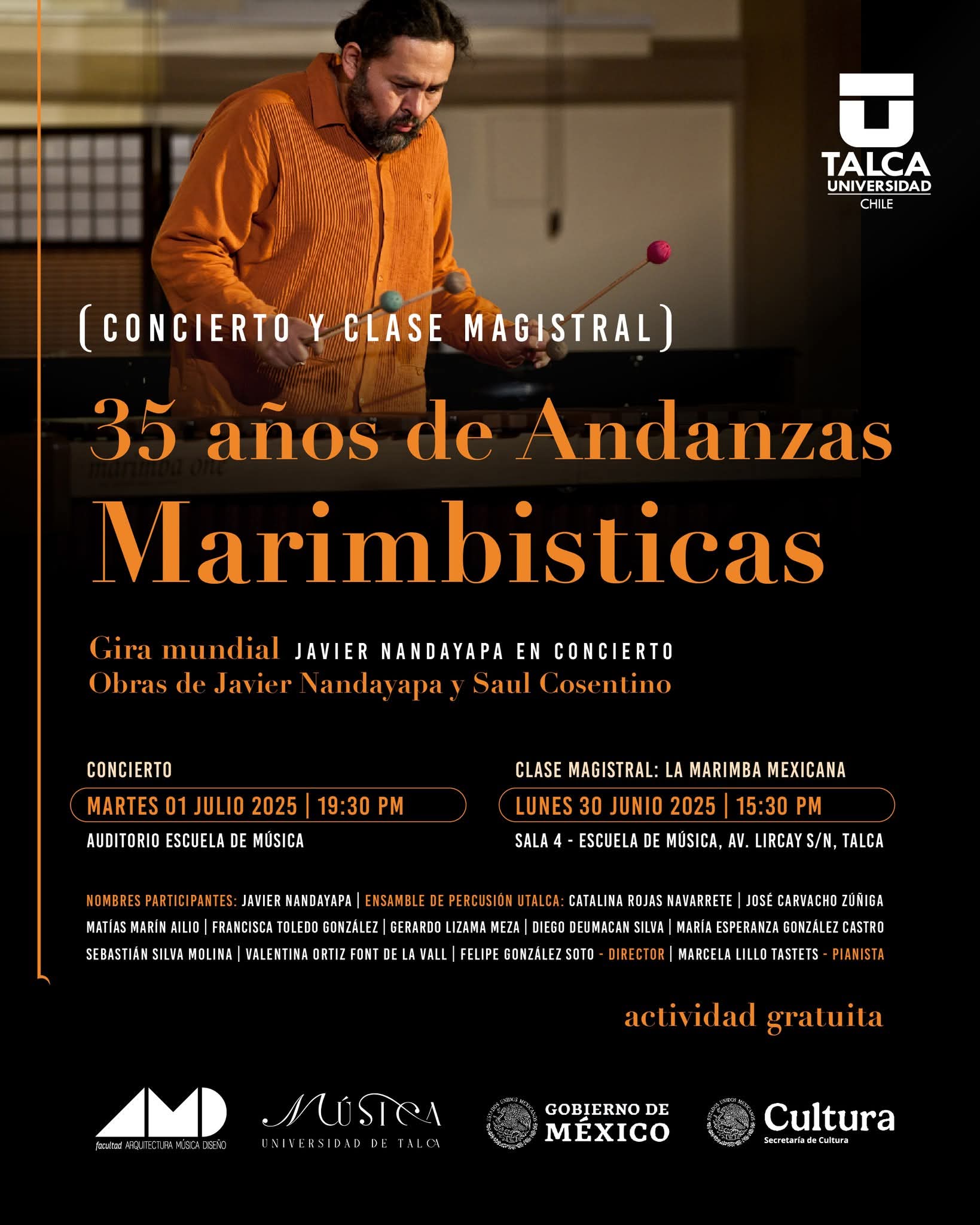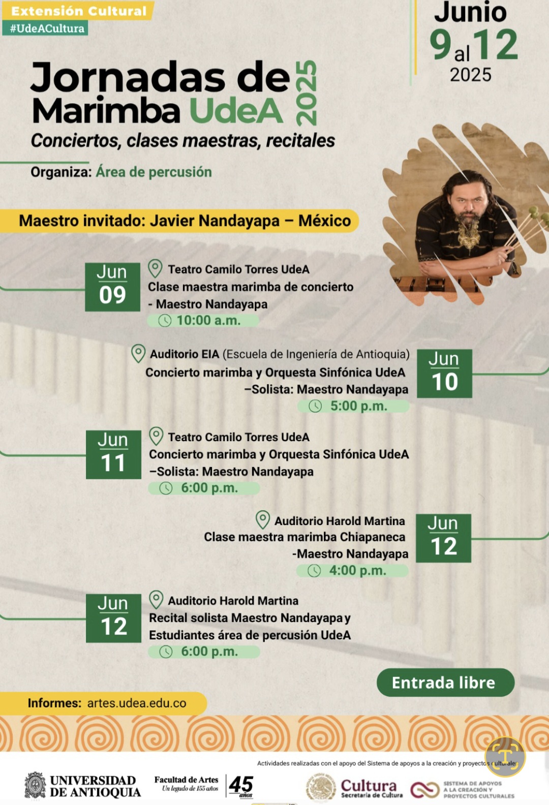 Presentaciones Internacionales LODZ POLONIA 2025 BRNO REPÚBLICA CHECA 2025 UNIVERSIDAD DE DEBRECEN, HUNGRÍA 2025 GDÁNSK POLONIA 2025 VILNIUS LITUANIA 2025 BUENOS AIRES, ARGENTINA 2025 BUENOS AIRES, ARGENTINA 2025 BUENOS AIRES ARGENTINA 2025 BUENOS AIRES ARGENTINA 2025 GIRA DE OCHO CONCIERTOS EN DINAMARCA 2025 SANTA COMBA DAO, PORTUGAL 2025 UNIVERSIDAD DE TALCA, CHILE 2025 ORQUESTA SINFÓNICA NACIONAL DE PANAMÁ 2025 ASUNCIÓN PARAGUAY 2025 UNIVERSIDAD DE ANTIOQUÍA, MEDELLÍN COLOMBIA 2025 UNIVERSIDAD DE ANTIOQUÍA, MEDELLÍN COLOMBIA 2025 UNIVERSIDAD DE ANTIOQUÍA, MEDELLÍN COLOMBIA 2025 KYUSHU, FUKUOKA JAPÓN 2025 KYUSHU, FUKUOKA JAPÓN 2025 KYUSHU, FUKUOKA JAPÓN 2025 OSAKA, JAPÓN 2025 NAGOYA, JAPÓN 2025 NAGOYA, JAPÓN 2025 XI’AN CHINA 2025 XI’AN CHINA 2025 FESTIVAL DE JAZZ Y HERENCIA, NUEVA ÓRLEANS LUISIANA, EUA 2025 UNIVERSIDAD DE NEVADA LAS VEGAS EUA 2025 SYDNEY, AUSTRALIA 2025 ADELAIDE, AUSTRALIA 2025 ULAN BATOR, MONGOLIA 2025 ULAN BATOR, MONGOLIA 2025 ULAN BATOR, MONGOLIA 2025 ULAN BATOR, MONGOLIA 2025 UNIVERSIDAD RICE, HOUSTON TEXAS, EUA 2024 UNIVERSIDAD DE NEVADA LAS VEGAS, EUA 2023 CICLO MARIMBA ON-LINE 2021 CICLO MARIMBA ON-LINE 2021 QUEBÉC, CANADÁ 2020 GIRA EN ESPAÑA 2020 CASTELLÓN, ESPAÑA 2020 RIGA, LETONIA 2020 COPENHAGUE, DINAMARCA 2020 GIRA EN EUROPA 2020 BJELOVAR, CROACIA 2020 GIRA EN PORTUGAL 2019 ÉVORA, PORTUGAL 2019 GIRA EN BRASIL 2019 ASUNCIÓN, PARAGUAY 2019 ASUNCIÓN, PARAGUAY 2019 ASUNCIÓN, PARAGUAY 2019 MELBOURNE, AUSTRALIA 2019 ADELAIDE, AUSTRALIA 2019 HURLINGHAM, ARGENTINA 2019 BUENOS AIRES, ARGENTINA 2019 SAN MIGUEL, ARGENTINA 2019 MORÓN, ARGENTINA 2019 LA PLATA, ARGENTINA 2019 BAHÍA, BRASIL 2019 VALPARAÍSO, CHILE 2019 OPORTO, PORTUGAL 2019 TOMAR, PORTUGAL 2019 BAKÚ, AZERBAIYÁN 2019 BAKÚ, AZERBAIYÁN 2019 TAIPÉI, TAIWÁN 2019 PASTO, COLOMBIA 2019 UNIVERSIDAD LEE, TENNESSEE, EUA 2019 LIMA, PERÚ 2019 PANAMÁ, PANAMÁ 2019 UNIVERSIDAD DEL SUR DE MISSISSIPPI, EUA 2019 RECIFE, PE. BRASIL 2018 MANAUS, AM. BRASIL 2018 MACIEÓ, AL. BRASIL 2018 JOAO PESSOA, BRASIL LAS VEGAS NEVADA 2017 GUATEMALA 2017 MADRID, ESPAÑA 2016 TOMAR, PORTUGAL 2016 CALI, COLOMBIA 2016 GDYNIA, POLONIA 2015 COSTA RICA 2016 GDANSK, POLONIA 2015 KIEL ALEMANIA 2015 LODZ, POLONIA 2015 LITUANIA 2015 SANTIAGO DE CHILE 2015 RIBEIRAO PRETO, BRASIL 2015 LIMA, PERÚ 2015 MACEIÓ, BRASIL 2015 PATAGONIA, ARGENTINA 2015 SAO PAULO & RIO, BRASIL ARGENTINA 2015 BAHIA, BRASIL 2015 ARGENTINA 2015 MONTEVIDEO, URUGUAY 2015 LITUANIA 2014 JOAO PESSOA, BRASIL 2015 UBERLANDIA, BRASIL 2014 LONDRINA, BRASIL 2015 RIO DE JANEIRO, BRASIL 2014 CALIFORNIA EUA 2014 CALIFORNIA, EUA 2013 COSTA RICA 2013 EL PASO, TEXAS 2012 POLONIA 2012 DINAMARCA 2012 KRAKOW, POLONIA 2012 DINAMARCA 2012 OPATOV, POLONIA 2012 RIGA, LETONIA 2012 LÜBECK, ALEMANIA 2012 LIMA, PERÚ 2012 KIEL, ALEMANIA 2012 GÖRLITZ, ALEMANIA 2011 BERLIN, ALEMANIA 2012 VIRGINIA, EUA 2011 UKMERGE, LITUANIA 2012 ORLANDO, FLORIDA 2011 KANSAS CITY, EUA 2011 TRIPOLI, LIBANO 2009 MINNEAPOLIS, EUA 2011 RIAD, ARABIA SAUDITA 2009 BEIRUT, LIBANO 2009 MANAMA, BAHRAIN 2009 EMIRATOS ÁRABES UNIDOS ARABIA SAUDITA 2009 LIMA, PERÚ 2009 BROWNSVILLE TEXAS 2008 WASHINGTON D.C. 2008 JOAO PESSOA, BRASIL 2007 RECIFE, BRASIL 2008 ROSARIO, ARGENTINA 2007 SANTIAGO DE CHILE 2008 ANTIGUA, GUATEMALA 2007 BELICE 2007 ARGENTINA 2006 ASUNCIÓN, PARAGUAY 2007 MONTEVIDEO, URUGUAY 2006 PATAGONIA, ARGENTINA 2006 PATAGONIA, ARGENTINA 2004 ARGENTINA 2006 NUEVA YORK EUA 2004 BEIRUT, LIBANO 2004 VALENCIA, ESPAÑA 2003 MALLORCA, ESPAÑA 2004 BARCELONA, ESPAÑA 2003 FELANITX, ESPAÑA 2004 NEVADA, EUA 2002 SAJONIA, ALEMANIA 2004 GUATEMALA C.A. 2002